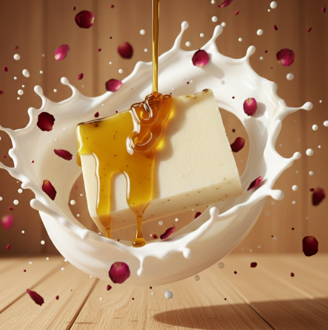 a bar inspired by the comfort of rose milk and the elegance of slow, mindful bathing.Each soap is handcrafted in small batches using: